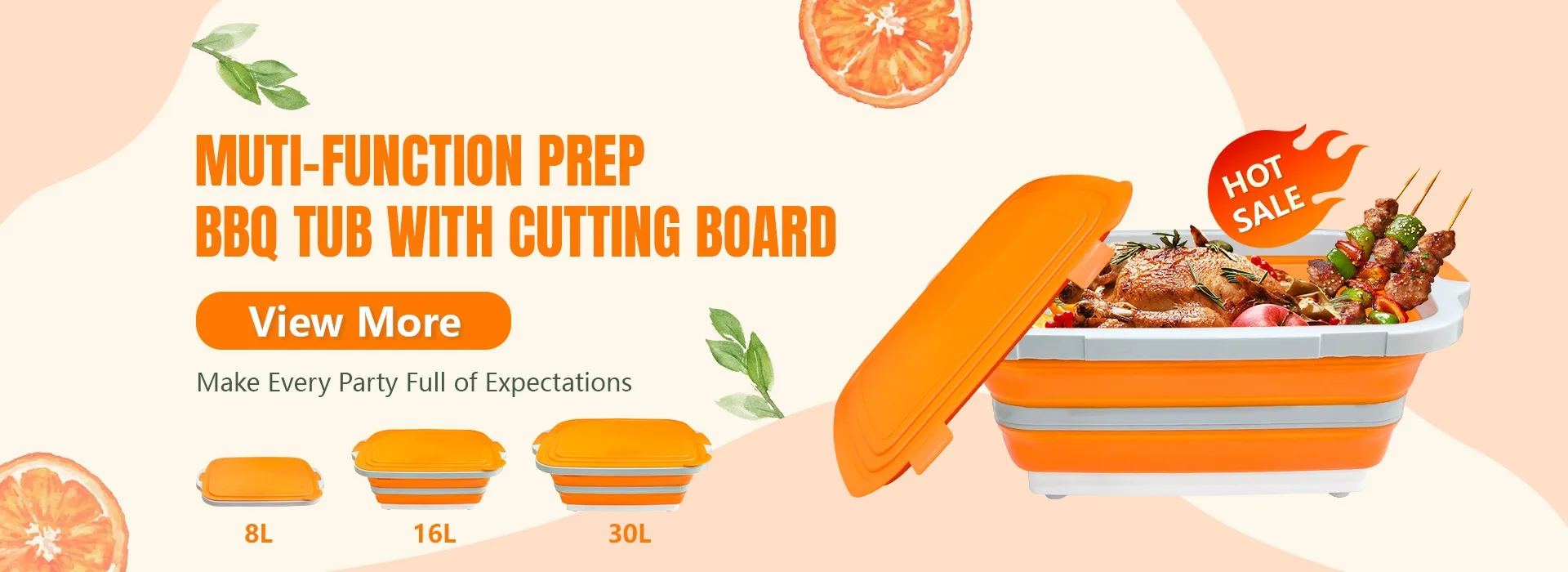 เขียงยางแบบพับได้มีหัวเข็มขัด8L ถังบาร์บีคิวแบบพกพาพร้อมภาชนะอุปกรณ์เตรียมอาหารทรงสี่เหลี่ยมเป็นมิตรกับสิ่งแวดล้อม